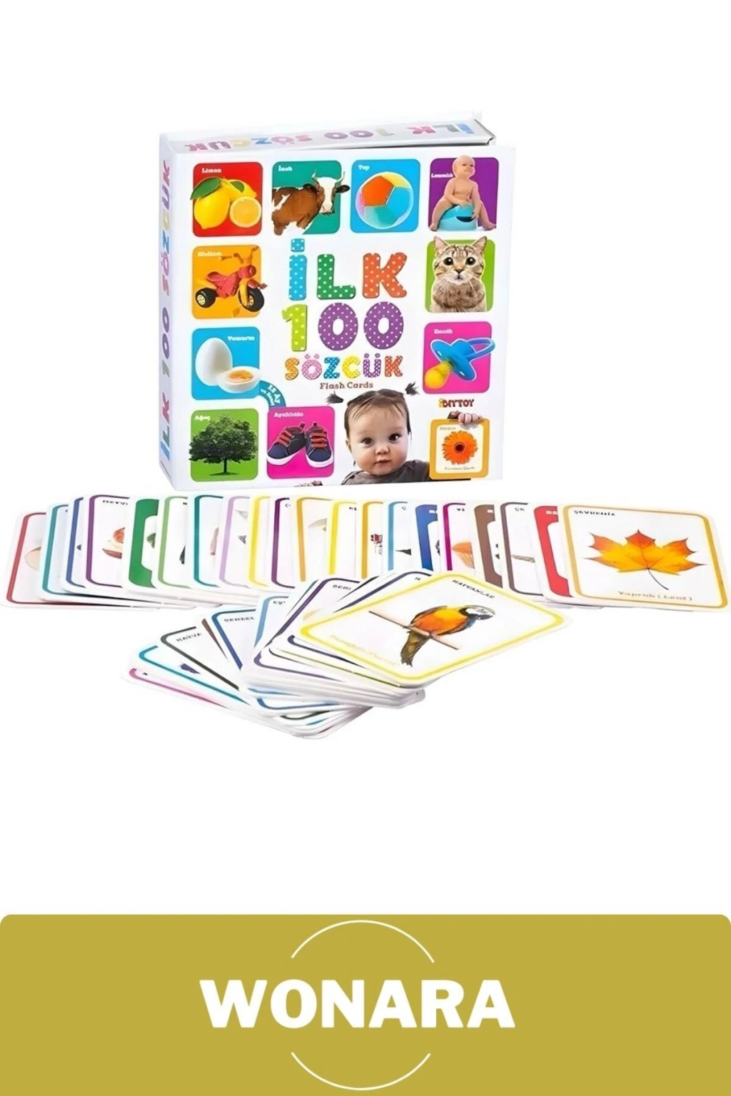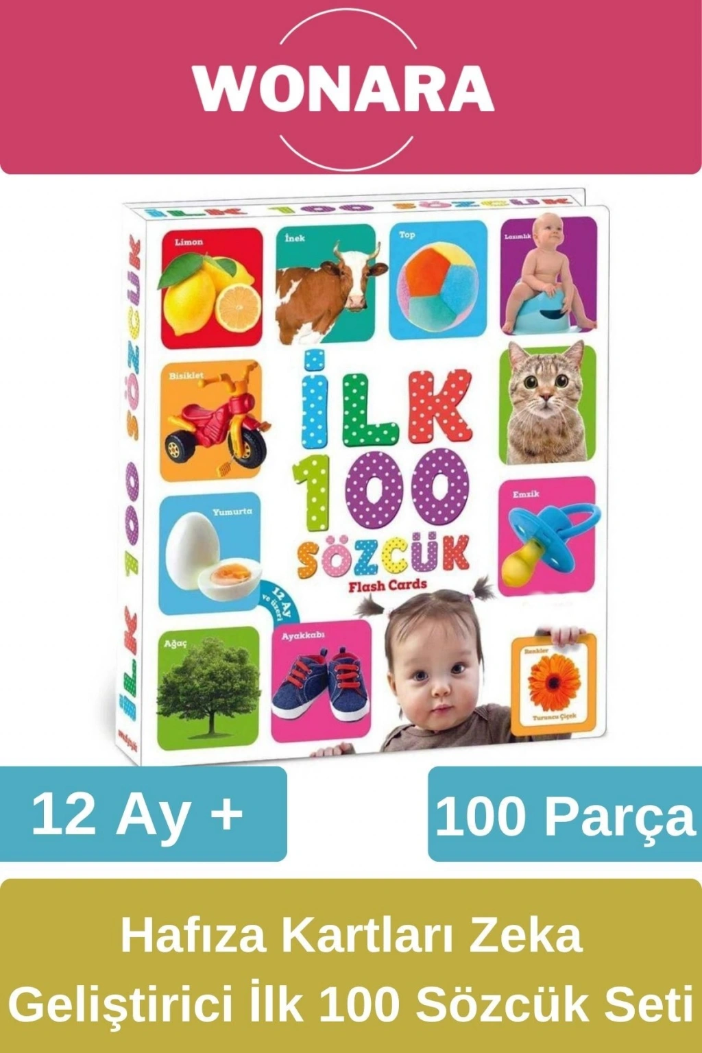 Hafıza Kartları İlk 100 Sözcük ile minikler hem öğrenecek hem de eğlenecekler! Sevgili Anne ve Babalar; bu eğlenceli flash cardlar çocukların dünyasında yer alan ilk 100 temel sözcüğü içerir.; Bu sözcükler ve resimler ile çocuklarınızın konuşmayı öğrenmeleri için gerekli ilk adımları atmalarına yardımcı olabilir, erken yaşta zeka gelişimlerine katkı sağlayabilirsiniz.; Çocuklara resimlerle örnek vererek öğrenimi ve akılda kalıcılığı kolaylaştırmaktadır.; Çocukların konuşmaya başladıkları dönemde ki ilk olarak tanıyacakları nesneleri barındıran ilk 100 sözcük kartları ile çocuklar günlük yaşamda ki kelimeleri eğlenerek öğrenecekler.; 12 ay ve üzeri çocuklar için; zeka gelişimlerini, konuşma becerilerini, merak uyandırma, görsel hafıza ve nesneleri tanımasına yardımcı olmaktadır.; Kart sayısı: 100 adet Ürün ölçüsü: 18 x 19 cm Kutu ölçüsü: 20 x 4,5 x 21 cm Ağırlık: 0,550 kg