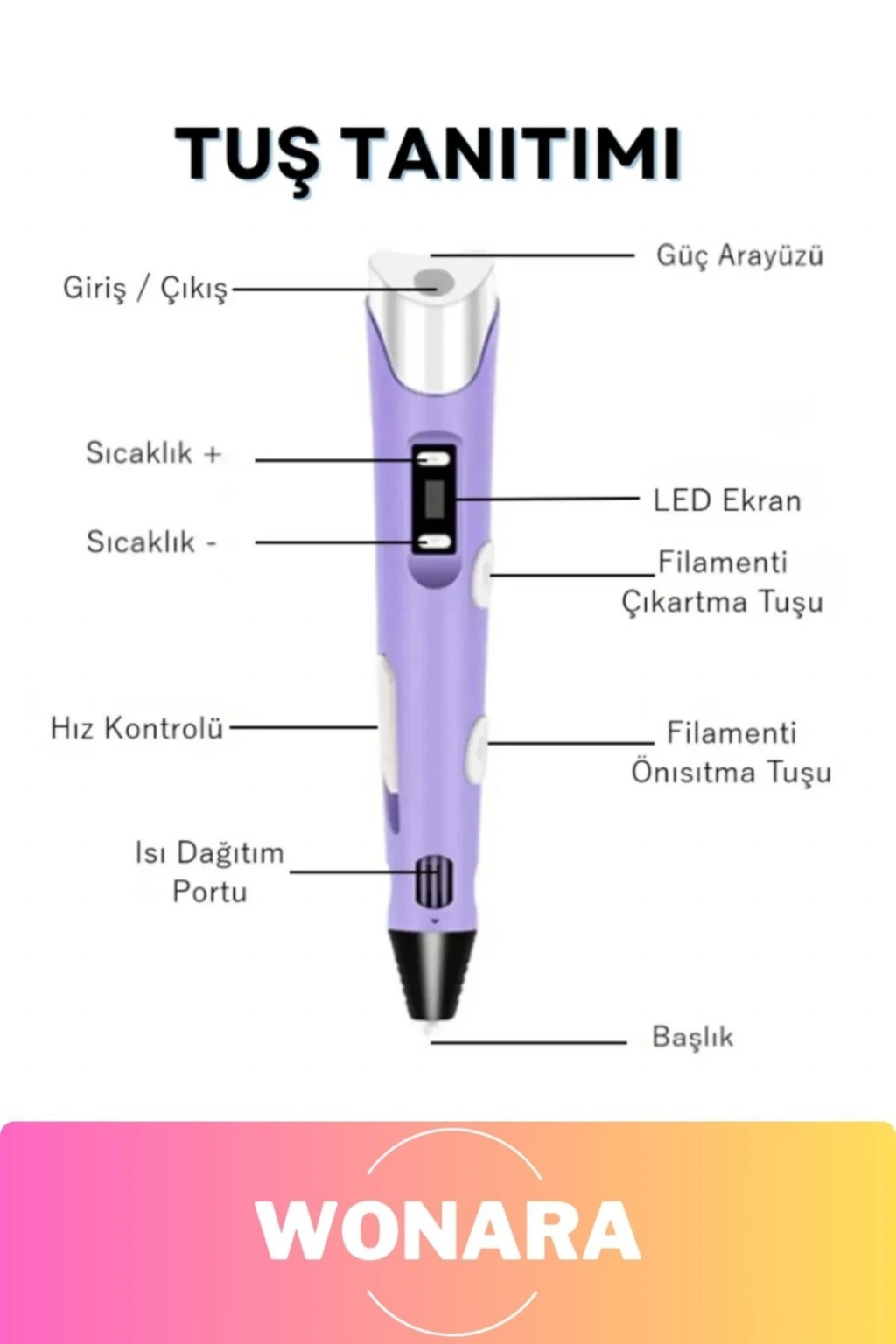 Üretilen 3D kalem ve kalem içinde kullanılan plastik filamentler ile tasarımında sınırı kullanıcının hayallerine bırakıyor.