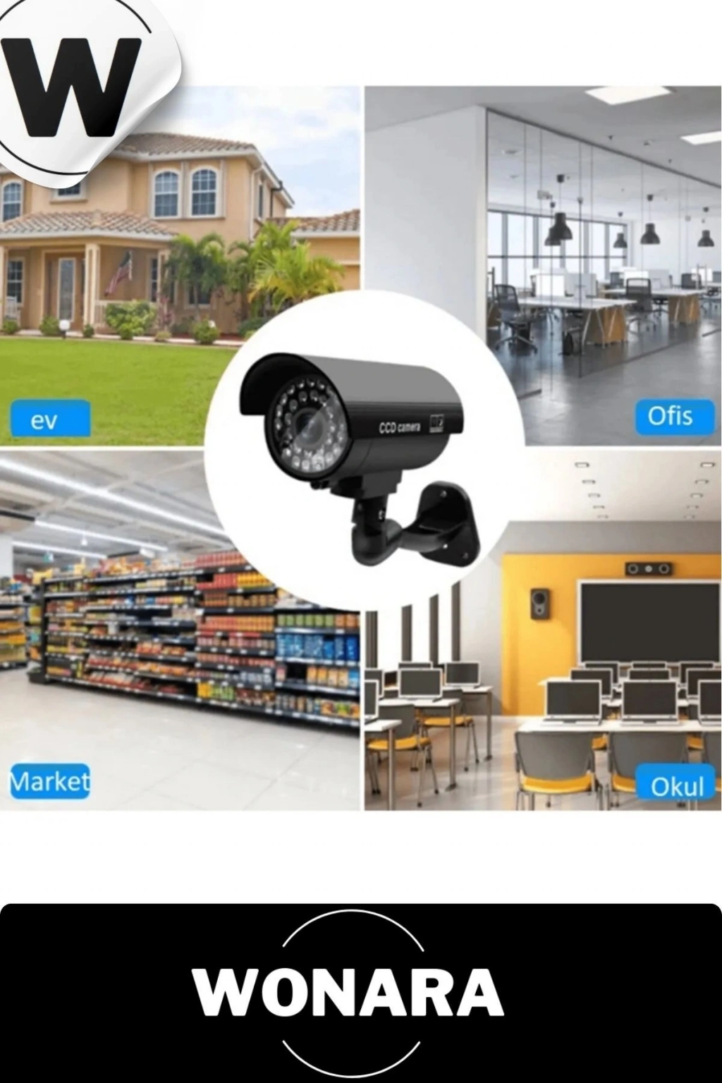 Sahte güvenlik kamerası aktivasyon ışığı sayesinde kayıt yapıyormuş izlenimi verir! ; Elektrik tesisatına ihtiyacı yoktur 2 adet +aa pille çalışır (piller pakete dahil değidir) ; Dekoratif kamera montaj parçaları dahildir. ; Apartman girişlerinde, işyerlerinde, garaj kapısında, müstakil evinizin girişine, yazlık evlerinizde veya koridorlarda istediğiniz her yerde kullanabilirsiniz. ; Paket içeriği: ; 2 adet caydırıcı dekoratif güvenlik kamerası gece görüş görünümlü ; 4 adet dubel ; 4 adet vida ;