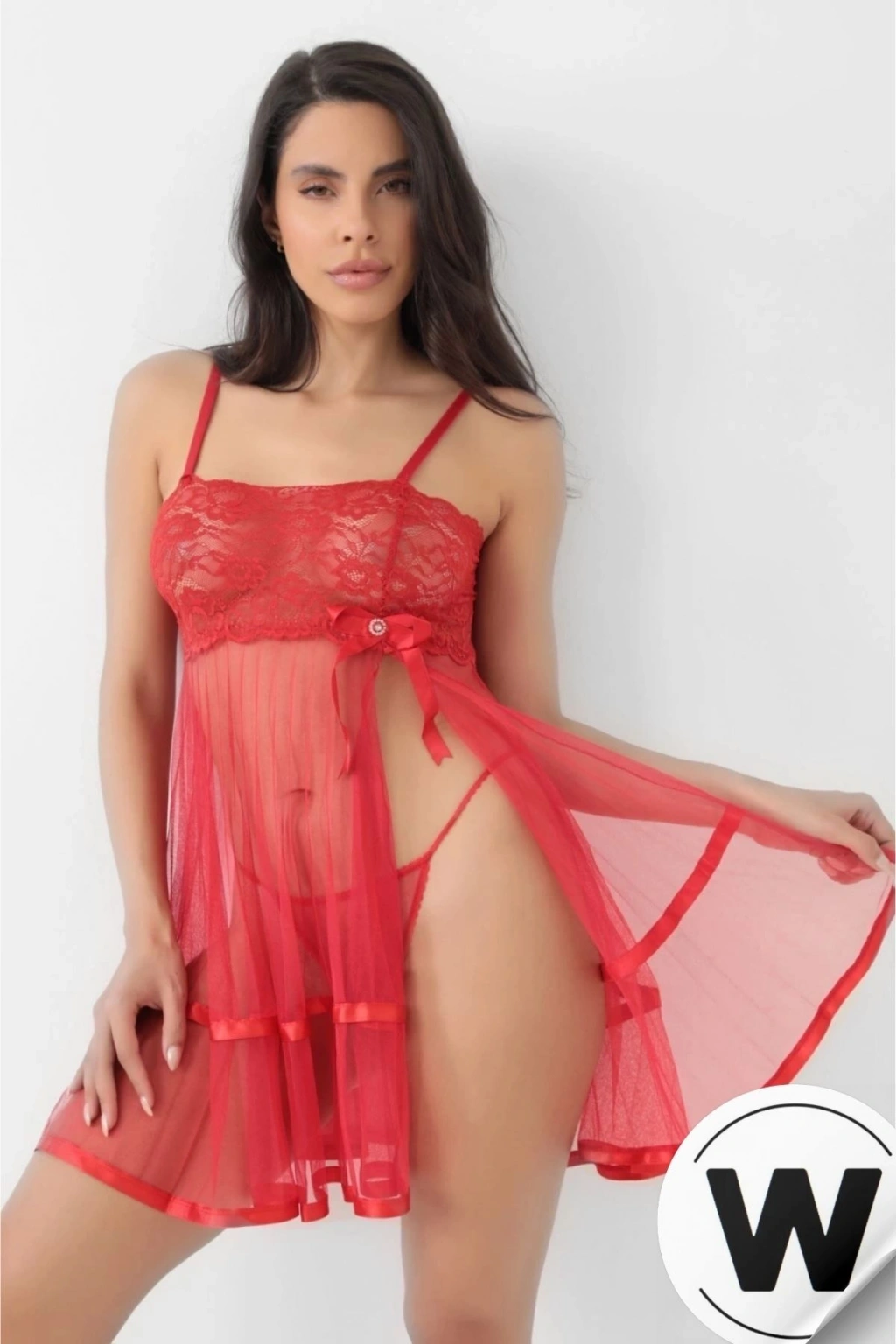Özel Tasarım Şeffaf İç Gösteren Seksi Kırmızı Tül Gecelik Kadın Zarif Fantezi Gece Kıyafeti
