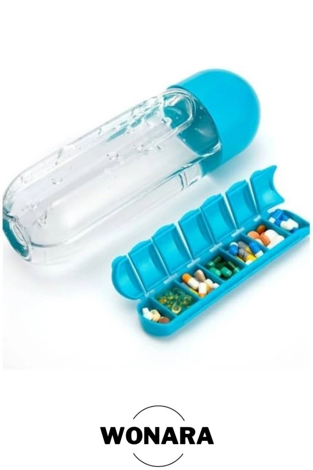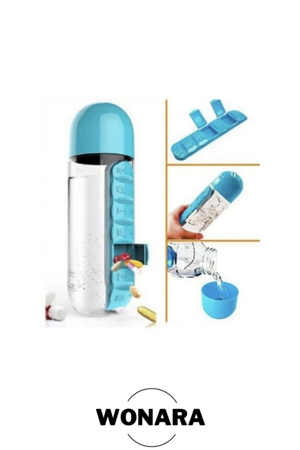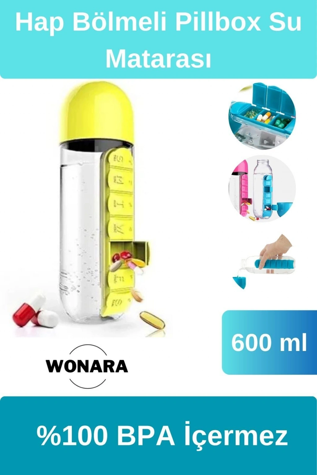 Ürün Özellikleri Su matarasını isterseniz pillboxlı isterseniz pillboxsız olarak kullanabilirsiniz.; Pillboxı mataradan kaydırarak çıkarabilirsiniz.; Pillbox kısımında haftanın her gününe ayrılmış günlerin baş harfleri bulunur.; Sağlık için %100 BPA içermeyen malzemeden üretilmiştir ve güvenlidir.; 600 ml kapasitelidir.; Paket İçeriği 1 adet pillbox su matarası