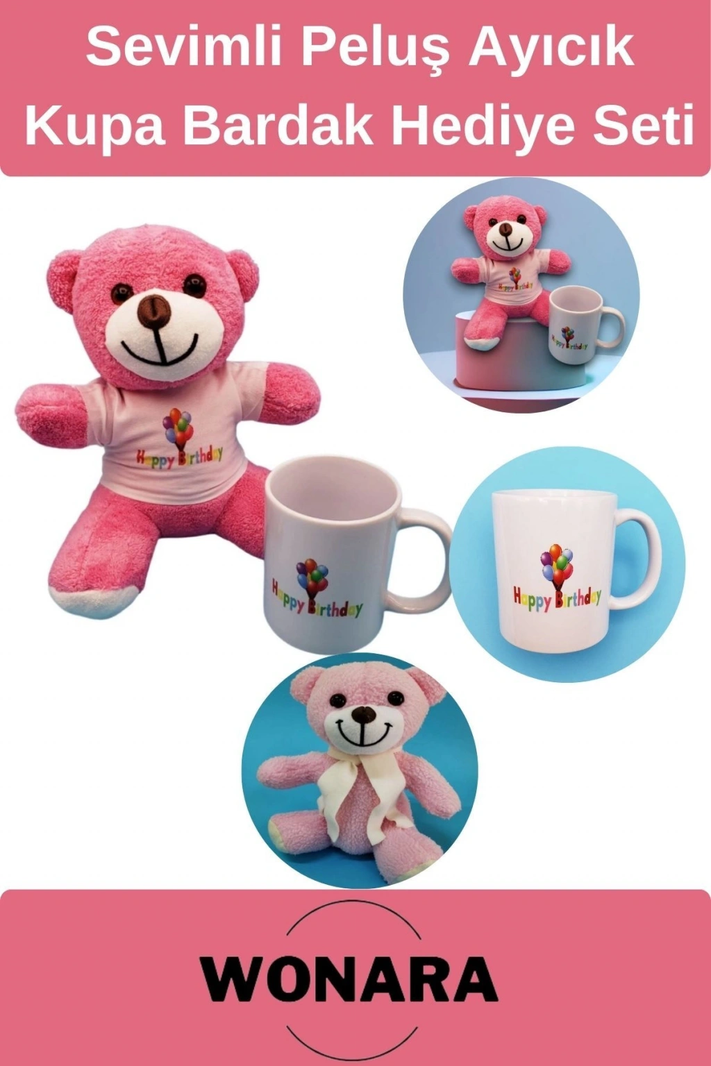 Happy birthday tasarımlı pembe ayıcık ve kupa sayesinde sevdiğiniz kişilere doğum günü hediyesi.; Doğum günü hediyesi olarak happy birthday baskılı tişörtlü pembe ayıcık ve kupa bardak ile hediye seti halinde verebileceğiniz şık hediyelerden.; Peluş pembe ayıcık hoş bir görünüme sahip olup hediye edeceğinizi kişinin hoşuna gidecektir.; Baskılı happy birthday kupa bardak ile pembe peluş oyuncak seti doğum günü hediyesi olarak verilebilecek en şık hediye setlerinden.; * Pembe oyuncak ayı kaliteli malzemeden üretilmiştir.; * Kupa bardak porselen malzemeden üretilmiştir.; * Baskılı tişört kaliteli kumaş malzemeden üretilmiştir.; * Doğum günü hediye seti.; * Tasarımı ve görünümü ile oldukça şık bir görünüme sahiptir.; Toptan Peluş Ayıcık Ölçüsü: 25 Cm Toptan Baskılı Tişört Ölçüsü: 11 cm x 16 cm Toptan Kupa Bardak Ölçüsü: 8 cm x 10 cm NOT: TİŞÖRTLER GİYDİRİLMEDEN GÖNDERİLMEKTEDİR.;