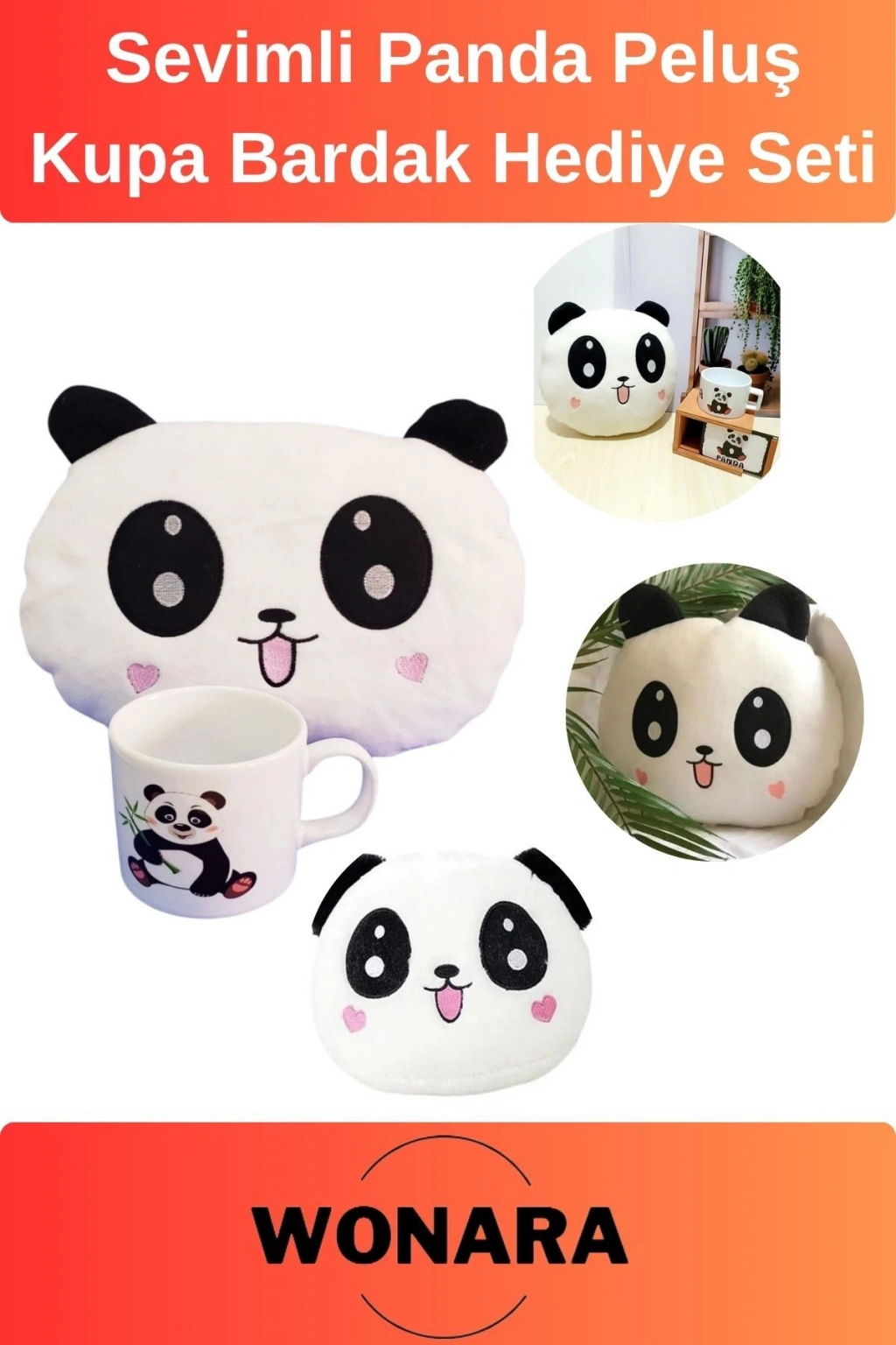 Panda Tasarımlı Kalp Yanaklı Yastık ve panda kupa