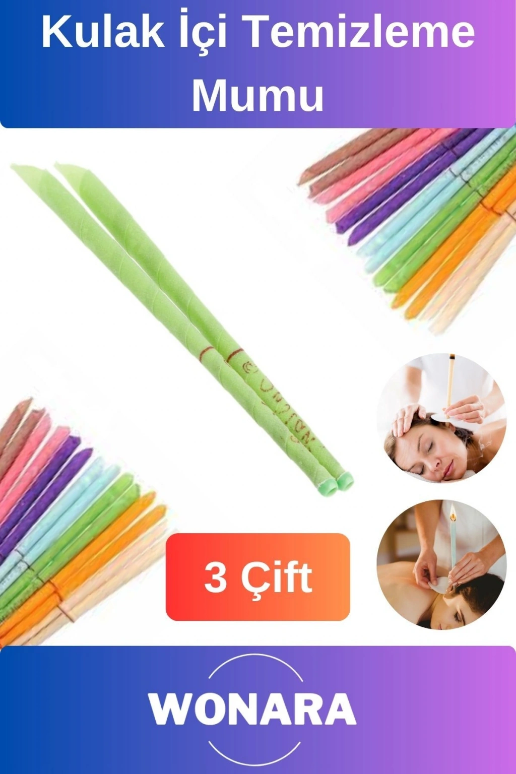 Kulak mumu yaptığı hava basıncı ile kulağınızda erişemeyeceğiniz bölgelerdeki kirlerin temizlenmesine yardımcı olmaktadır. ; 3 yaşından büyük olan herkes rahatlıkla kullanabilir ; ürün kullanımı: ; kullanımı basittir ve özel bir yeteneğe gerek yoktur. ; kulak mumu kullanımı oldukça basittir. ; mumun kulağa uygun kısmını, ince kısmı kulağınızı içine çok ileri olmayacak ve hava kaçırmayacak şekilde takınız. ; mumun orta kısmına daha önce hazırlanan orta kısmı delik olan kartonu geçiriniz, bu karton birlikte satılmaz bunu önceden hazırlayınız, ; bundaki amaç kulak kısmına mumdan dökülme olursa kulak kısmına zarar vermemesi içindir. ; üst kısımdan bir çakmak sayesinde yakın ve mum uygun kısma kadar yanmasını yanan mumun hava basıcı ile kirleri toplamasını sağlayın. ; kırmızı çizgiye kadar yanan mumu bir kase suya batırıp söndürebilirsiniz. ;