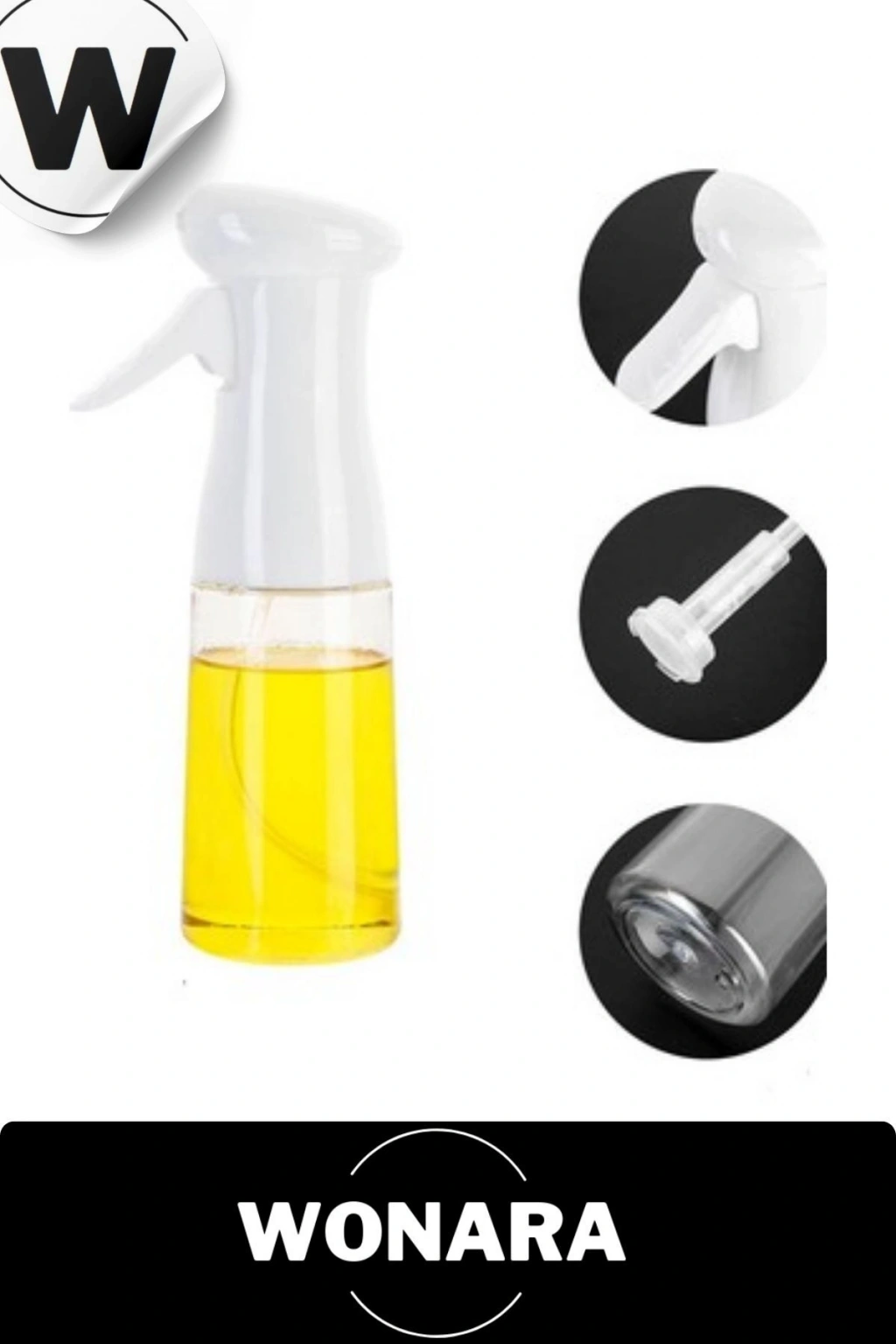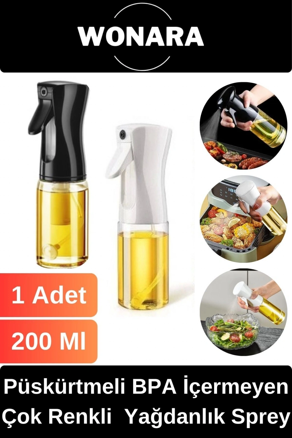 Püskürtmeli BPA İçermeyen Beyaz ve Siyah Plastik Fan Başlıklı Cam Şişe Yağdanlık Sprey 200 Ml