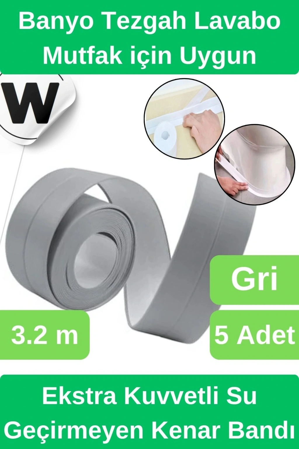 Premium Su Geçirmez Önleyici Yalıtım Küf Mutfak Banyo Lavabo Gri Kenar Şerit Bant 3.2m 5 adet