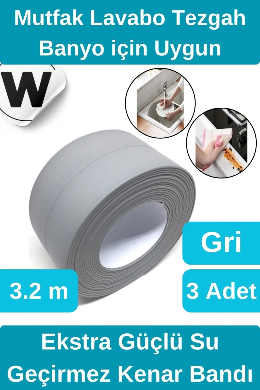 Premium Su Geçirmez Sızdırmaz Küf Yalıtım Banyo Mutfak Lavabo Gri Kenar Şerit Bant 3.2m 3 adet